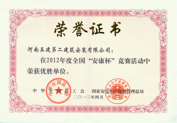 近日,全國安康杯組委會下發(fā)中華全國總工會、國家安全生產(chǎn)監(jiān)督管理總局對2012年度全國“安康杯”競賽先進(jìn)集體和優(yōu)秀個人進(jìn)行了通報表彰,公司再次獲得全國“安康杯”競賽優(yōu)勝單位稱號。