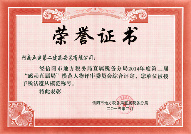 熱烈祝賀公司榮獲信陽市地稅20年稅法遵從模范單位