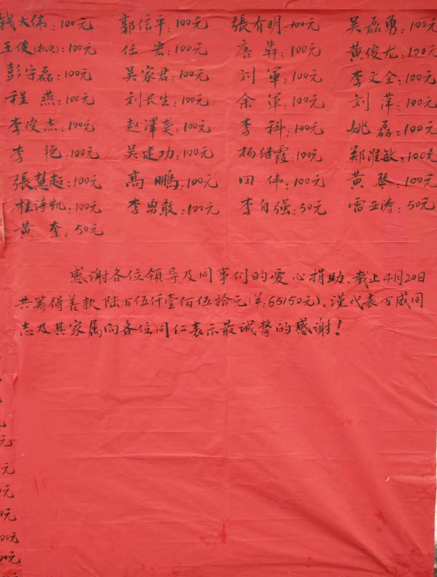 “一方有難,八方支援。”公司在得知萬威身患重癥,家庭困難的情況后,立即組織員工開展“送溫暖、獻愛心”募捐活動。公司全體員工紛紛伸出援助之手,踴躍捐款,慷慨解囊,共捐款65150元。