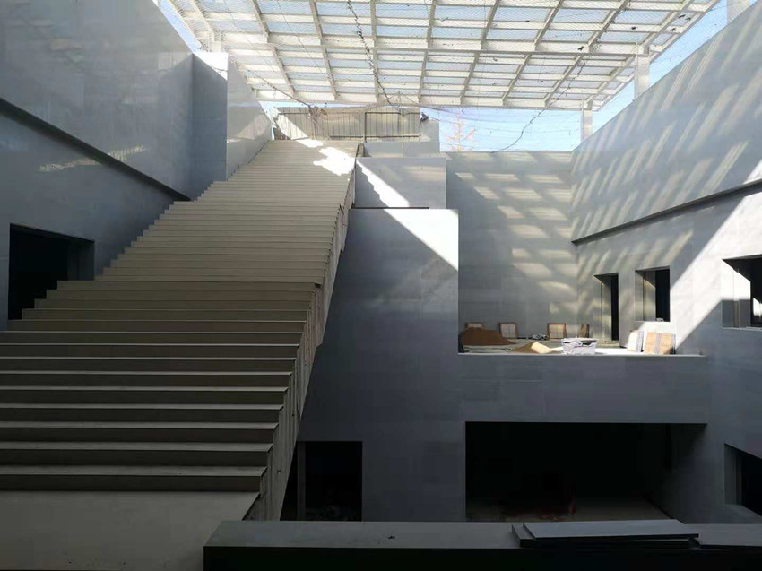 (1)干掛班組,負一層南北落客區(qū)及展廳花崗巖干掛及收邊收口全部完成。