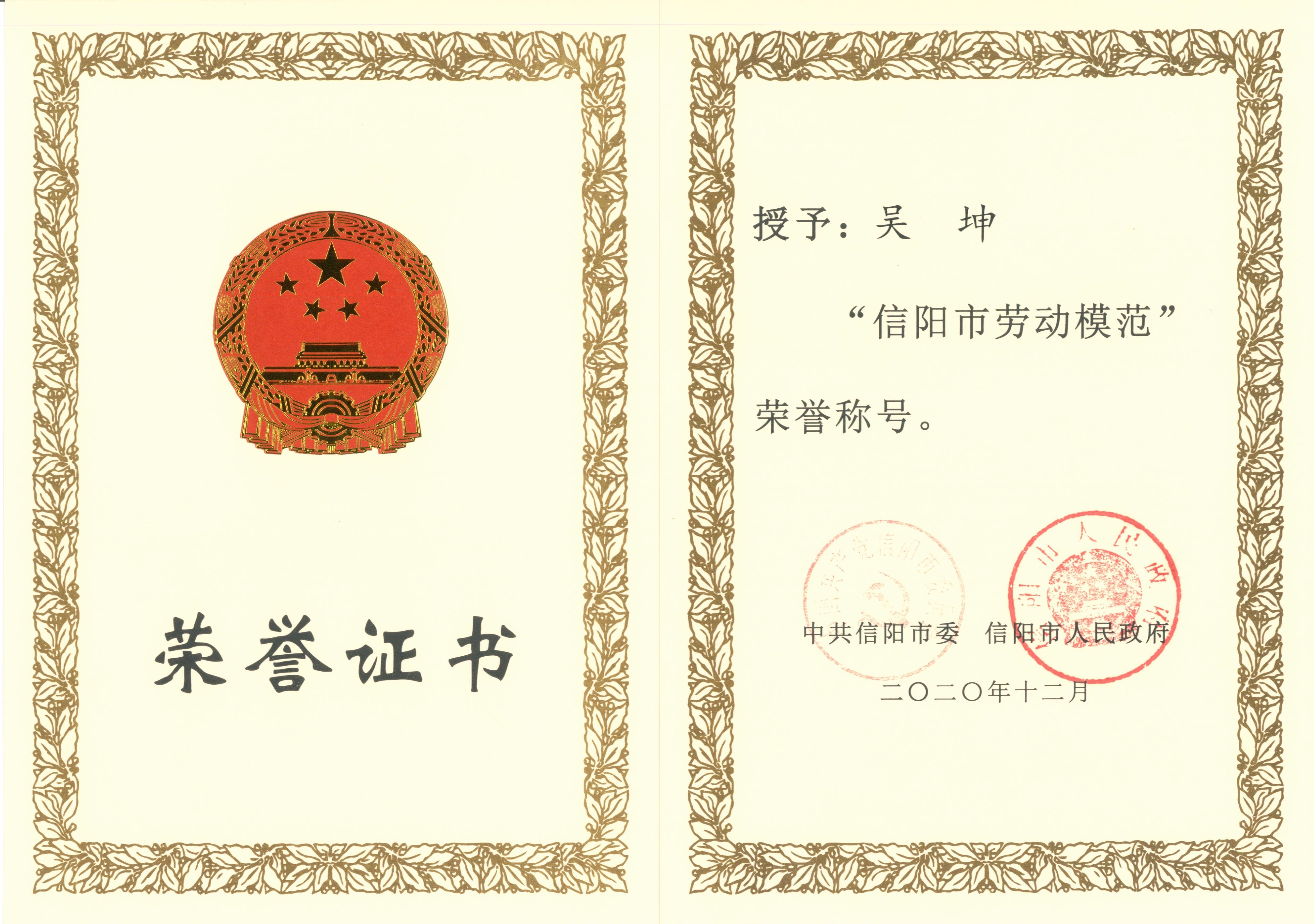 熱烈祝賀吳坤同志榮獲信陽(yáng)市勞動(dòng)模范稱號(hào)