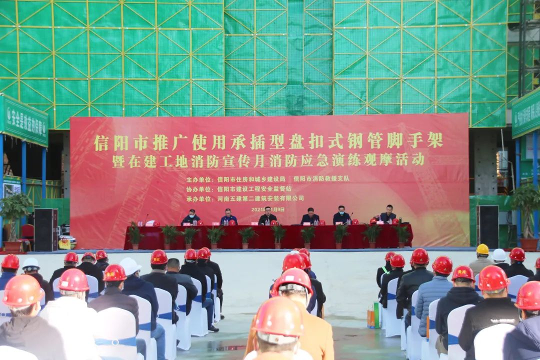 11月9日,在第三十個(gè)全國(guó)消防安全宣傳教育日來(lái)臨之際,公司第七項(xiàng)目部承建的太古·湖畔樾山項(xiàng)目迎來(lái)尊貴的客人,信陽(yáng)市推廣使用承插型盤扣式鋼管腳手架現(xiàn)場(chǎng)觀摩會(huì)暨消防應(yīng)急演練活動(dòng)在項(xiàng)目現(xiàn)場(chǎng)隆重舉行。信陽(yáng)市住建局黨組副書記、副局長(zhǎng)張奔、安監(jiān)站站長(zhǎng)馬其峰、副站長(zhǎng)楊傳臣、信陽(yáng)市消防救援支隊(duì)副隊(duì)長(zhǎng)王偉等領(lǐng)導(dǎo)親臨活動(dòng)現(xiàn)場(chǎng),公司黨委書記、董事長(zhǎng)吳萬(wàn)仁受邀出席活動(dòng)并講話。整場(chǎng)活動(dòng)由會(huì)議階段、演練階段和觀摩階段三部分組成,由安監(jiān)站站長(zhǎng)馬其峰負(fù)責(zé)主持。