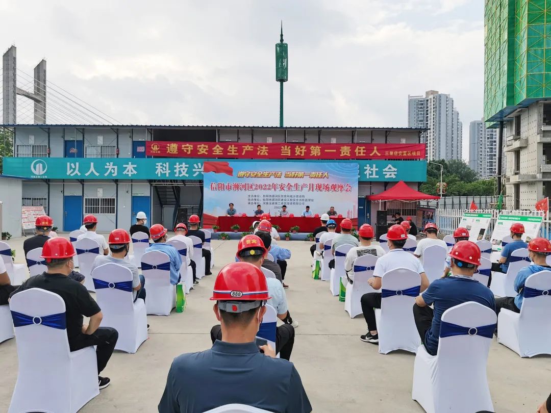 6月22日,信陽市浉河區(qū)2022年“安全生產(chǎn)月”現(xiàn)場觀摩會在公司第七項目部承建的信陽市浉河區(qū)城市有機更新安置區(qū)三里店片區(qū)建設項目順利舉行,浉河區(qū)住建局黨組成員、副局長熊國利、監(jiān)管股股長秦宏偉、安監(jiān)站黨組書記馬俊、站長朱偉以及轄區(qū)內(nèi)建筑施工企業(yè)安全負責人、在建項目經(jīng)理、項目安全負責人參加會議。公司副總經(jīng)理吳建功出席活動并講話。